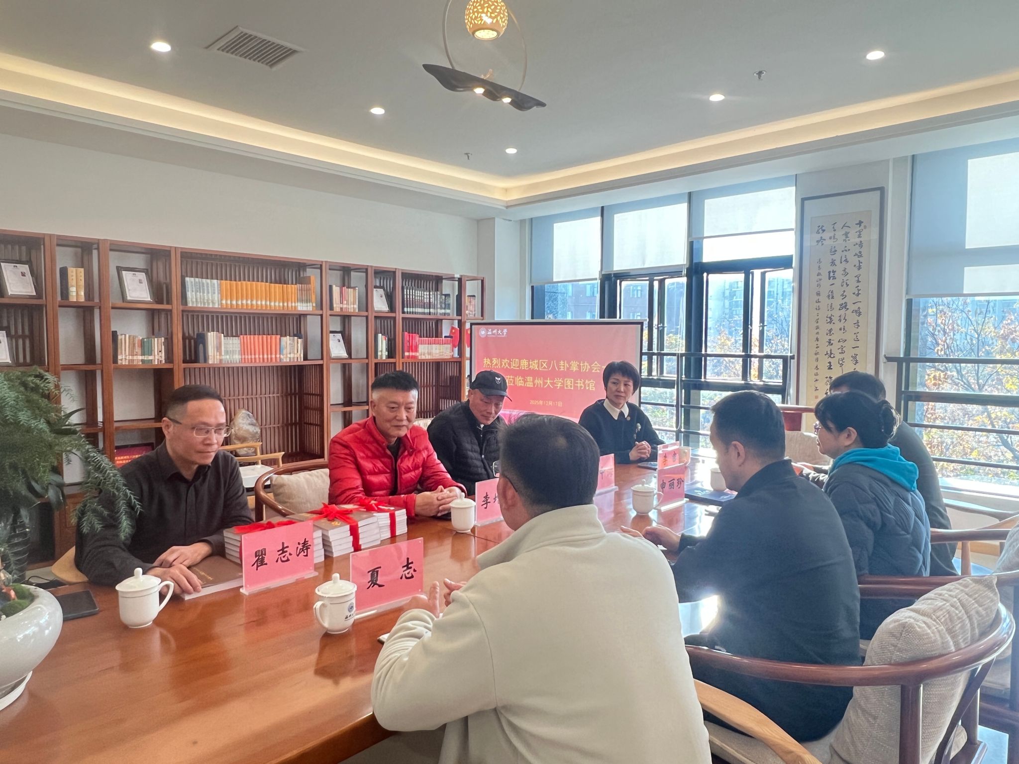来源:图书馆 作者:李莉 发布时间:2025-12-18 浏览次数:[ ]次12月17日上午,温州市鹿城区八卦掌协会终身名誉会长李增云、会长汤中海、副会长瞿志涛一行向温州大学图书馆捐赠武术类书籍《宫门八卦掌》《宫门八卦掌谱录》。温州大学国资处处长李密、图书馆副馆长周志峰、体育与健康学院副院长夏志出席捐赠仪式。